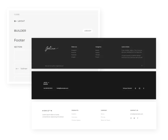 Additional footer builder. Add any content from the layout library and make your footer stand out on every page of your Joomla or WordPress website.