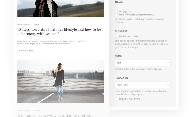 Multiple options for the blog and post layout. For instance, you can expand the gutter between columns or display dividers and much more.